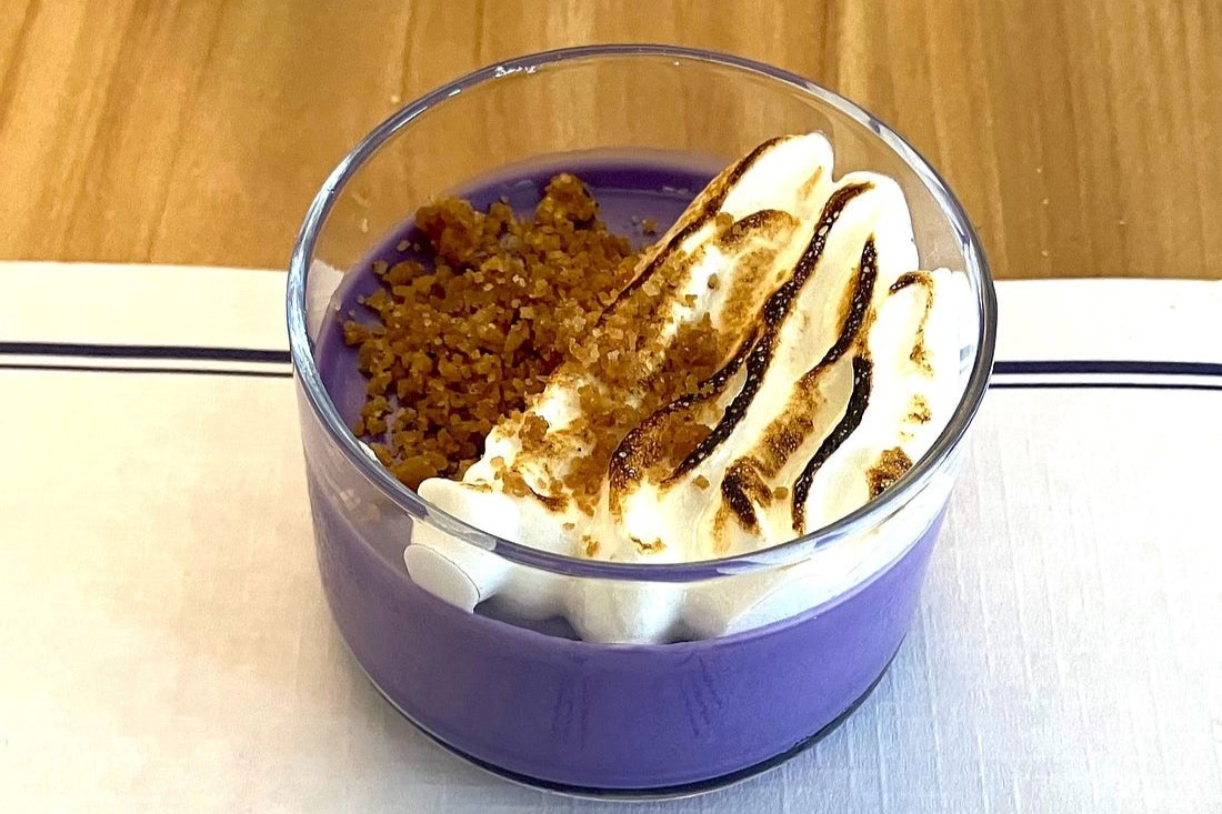 Purple pudding: Wini Moranville posted an “utterly charmed” review of her recent lunch at the Iowa Culinary Institute’s Bistro at DMACC. Themes vary from week to week, but for $17, you can have soup or salad, a main dish or the buffet, and a dessert, like the ube panna cotta topped with meringue (pictured). “This was one amazing dessert,” she wrote. “It was sweet and delightfully vanilla-y, but with earthiness to the tuber that kept it from being cloying.” Read the full account at Dining Well in DSM.