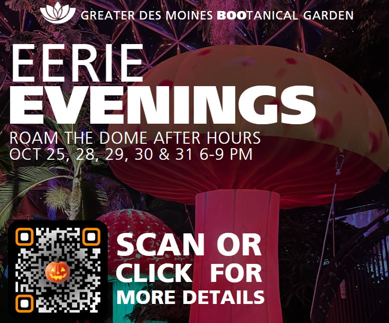 Spirits in the Gardens, Friday-Sunday evenings, Reiman Gardens in Ames. Perfect for family fun or a spooky date night, tour the gardens in your best costume and enjoy a path lit by more than 1,000 jack-o-lanterns.