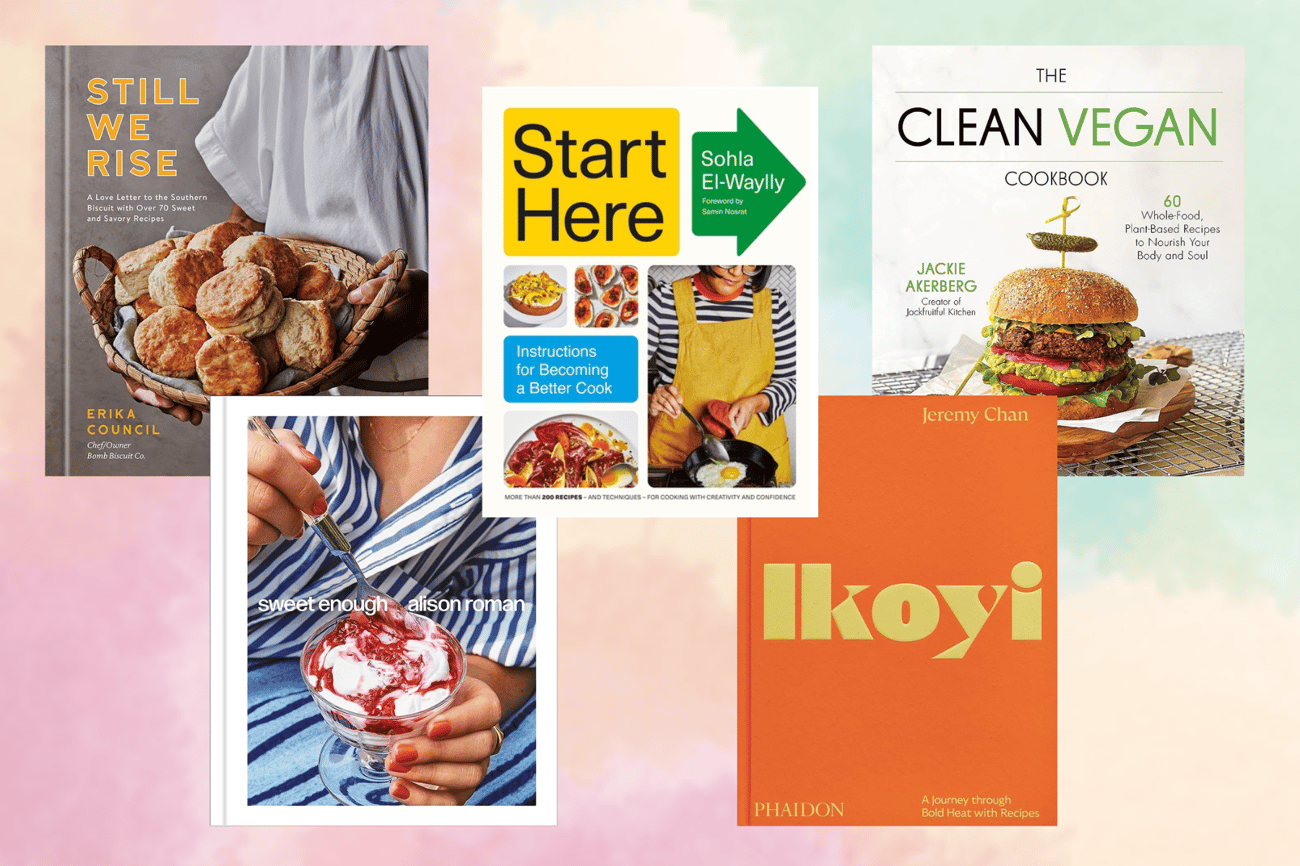 From left: "Still We Rise" by Erika Council; "Sweet Enough" by Alison Roman; "Start Here" by Sohla El-Waylly; "Ikoyi" by Jeremy Chan; and "The Clean Vegan Cookbook" by Jackie Akerberg.